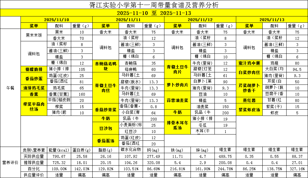 胥江实验小学第十一周带量食谱及营养分析(2025-11-10至 2025-11-14) 来源: 发布时间:2025-11-07 15:50:51 浏览次数: 次 【字体:小 大】 分享到: 【打印正文】