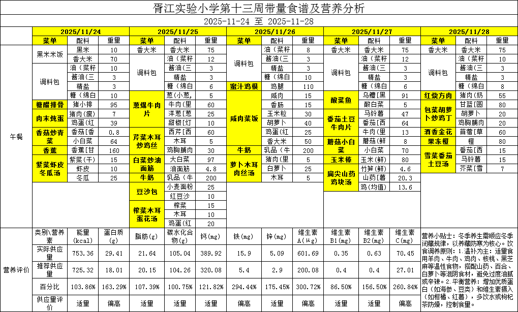 胥江实验小学第十三周带量食谱及营养分析(2025-11-24至 2025-11-28) 来源: 发布时间:2025-11-21 14:22:48 浏览次数: 次 【字体:小 大】 分享到: 【打印正文】